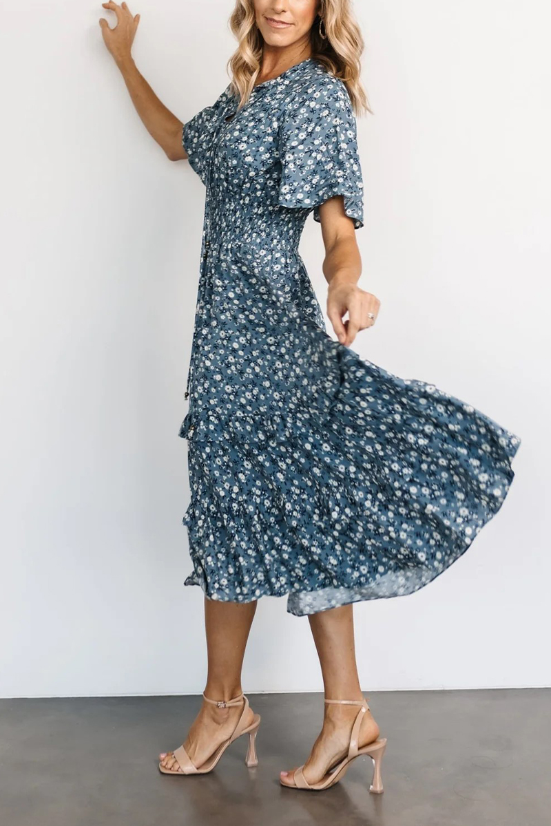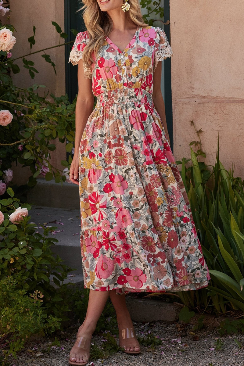 Women V-neck Short-sleeved Floral Casual Midi Dress$49.99 USD -