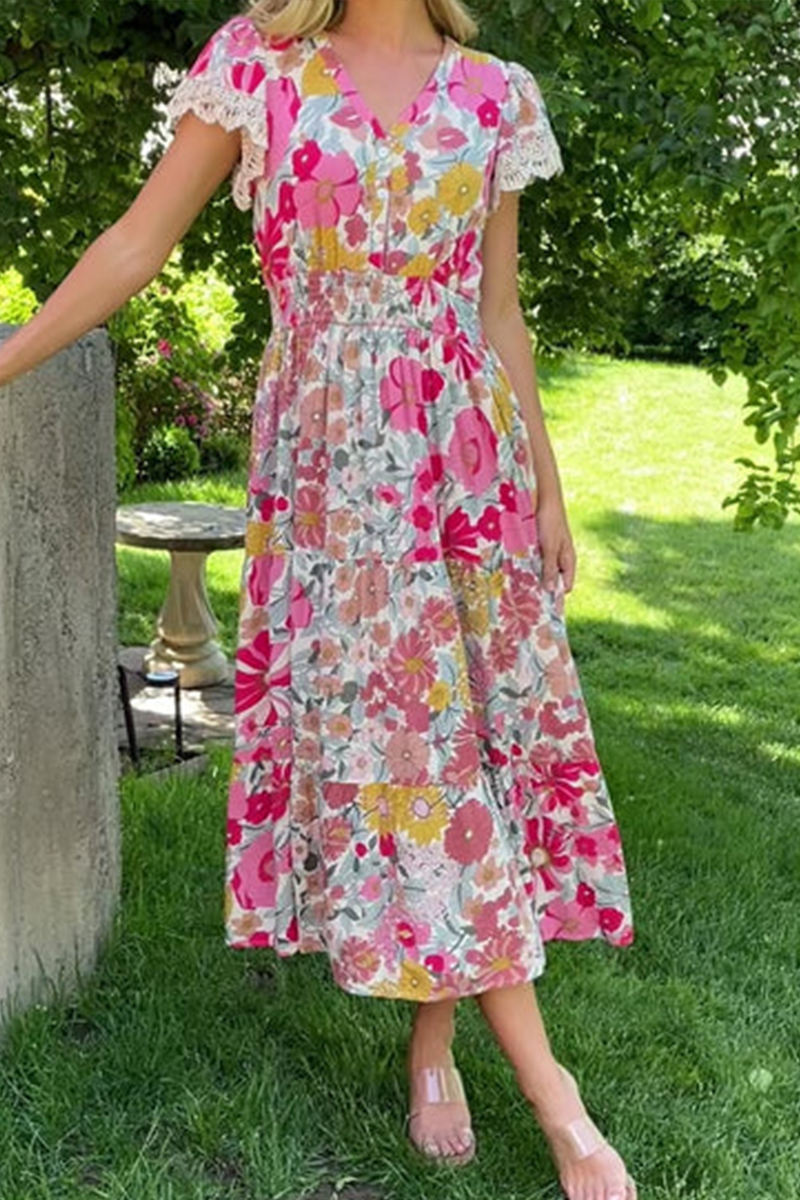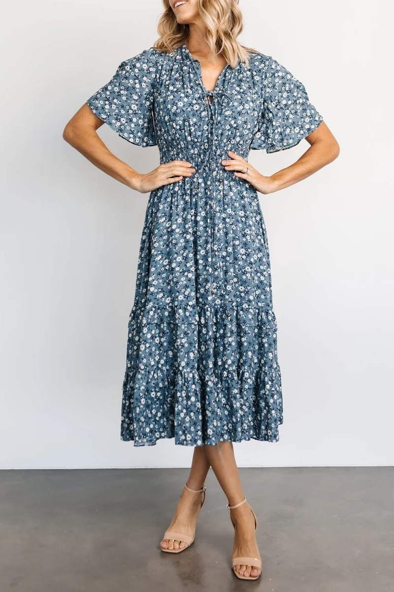 Womens V-neck Printed Short-sleeved Fitted Waist Elegant Casual Midi Dress$59.99 USD -