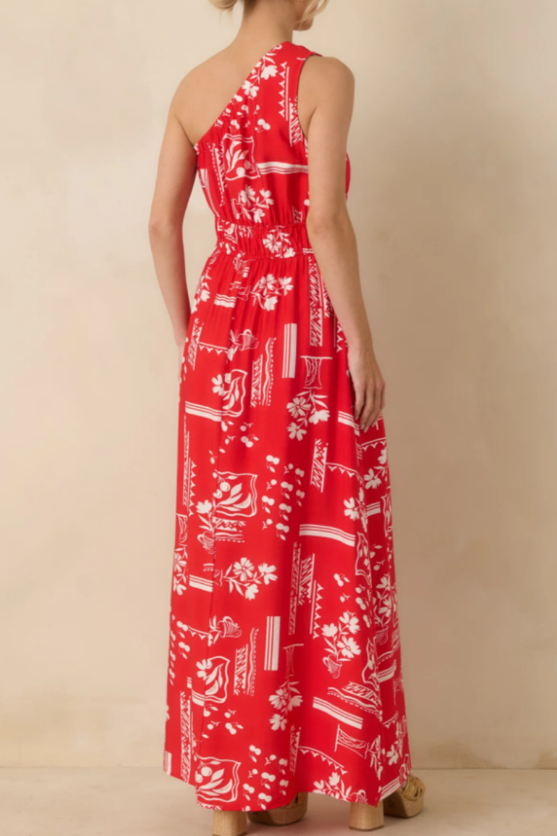 Anything Goes Red One Shoulder Geometric Floral Print Maxi Dress$49.99 USD -