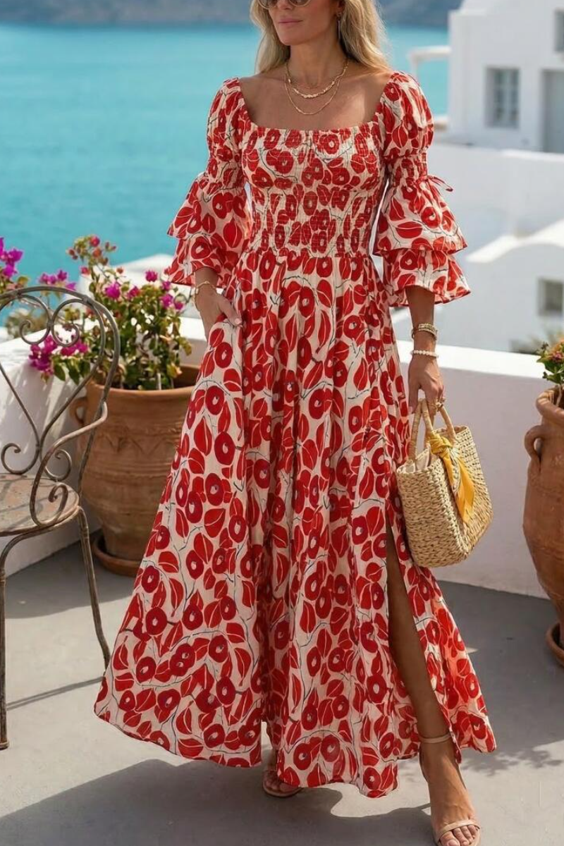 Women Square Neck Elbow Long Sleeved Printed Slit Elegant Temperament Maxi Dress$49.99 USD -