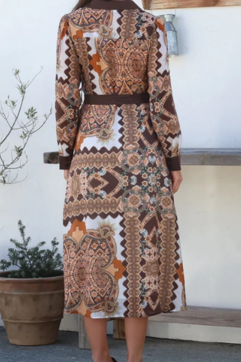 Women Collar Long Sleeved Printed Patchwork Bohemian Style Midi Dress$49.99 USD -